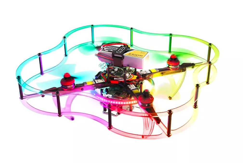 Устройство оснащено программируемой светодиодной лентой для улучшения видимости в воздухе и алгоритмом оптического потока, работающим на raspberry pi 4, который помогает поддерживать позиционирование в помещении.