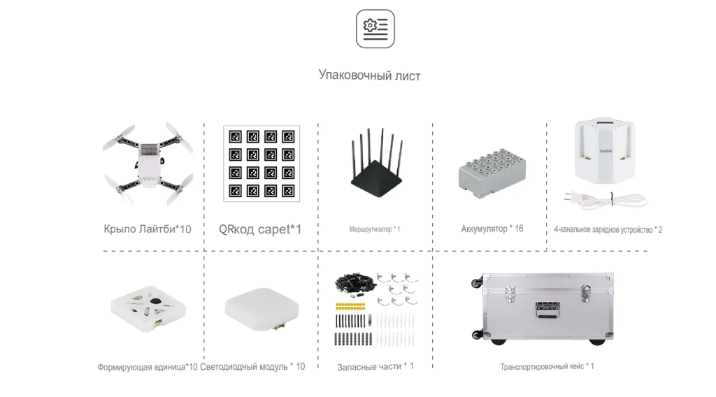 Комплектация | Набор дронов -10 шт STEM / Зарядное устройство для литиевых батарей х 10 / Коврик с QR-кодами х 1 / Маршрутизатор х 1 / Литиевая батарея х 16 / Модуль позиционирования х 10 / Фонари х 10 / Соединительный кабель х 10 / Зарядная база х 10 / Кабель микро-USB х 10 / Ключ для пропеллеров х 1 / Инструкция х 1 / Кейс транспортировочный х 1 / Запасные винты (по часовой стрелке / против часовой стрелки по 2 шт.) х 10 / Запасные моторы (по часовой стрелке / против часовой стрелки по 2 штуки) х 8 / Запасные штифты (стандарт: 100 | половина: 10) х 4 / Руководство |