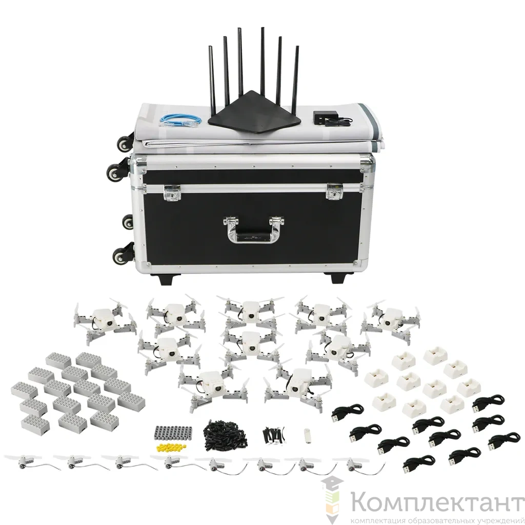 Комплектация | Набор дронов -10 шт STEM / Зарядное устройство для литиевых батарей х 10 / Коврик с QR-кодами х 1 / Маршрутизатор х 1 / Литиевая батарея х 16 / Модуль позиционирования х 10 / Фонари х 10 / Соединительный кабель х 10 / Зарядная база х 10 / Кабель микро-USB х 10 / Ключ для пропеллеров х 1 / Инструкция х 1 / Кейс транспортировочный х 1 / Запасные винты (по часовой стрелке / против часовой стрелки по 2 шт.) х 10 / Запасные моторы (по часовой стрелке / против часовой стрелки по 2 штуки) х 8 / Запасные штифты (стандарт: 100 | половина: 10) х 4 / Руководство |