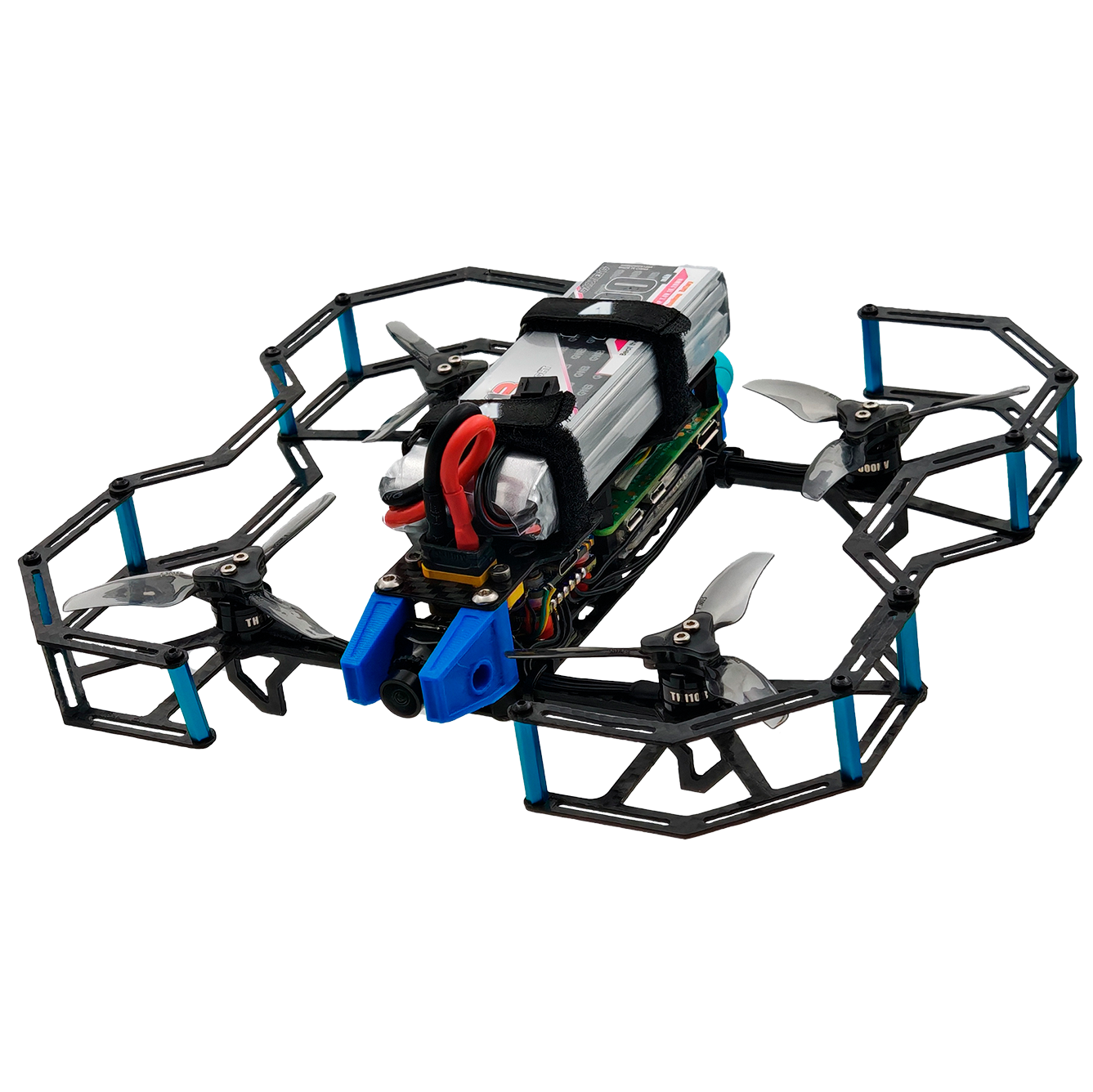 Эта модель микроквадрокоптера компактна и включает в себя интегрированный набор датчиков и модуль относительного позиционирования. Она обладает защитным карбоновым корпусом и защитой винтов.