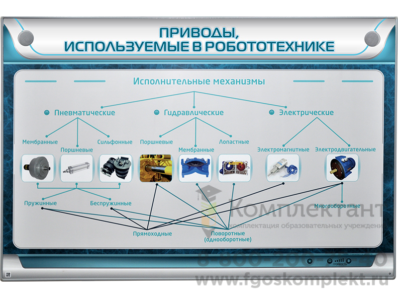 Электрифицированный стенд представляет собой панель с раздельной световой индикацией. На стенде представлена информация о приводах, использующихся в робототехнике, – сервоприводы, пневмоприводы и т.п. В конструкции учебного оборудования интегрированы высокочувствительные сенсоры для управления стендом при помощи интерактивного воздействия приемо-передающих устройств.