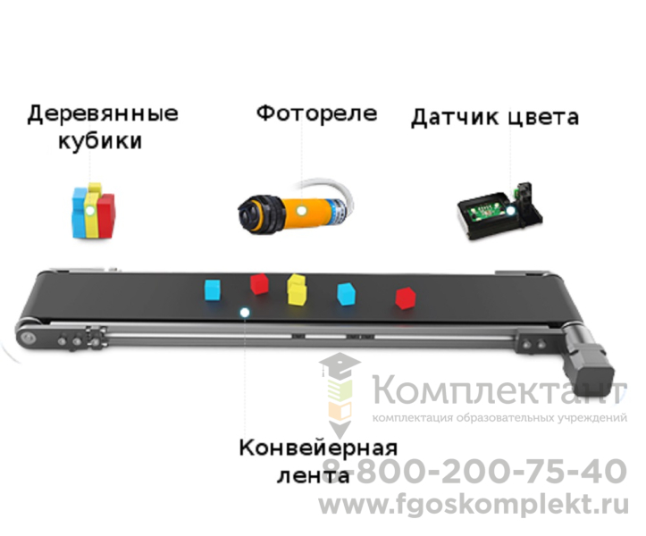 Фотоэлектрический выключатель позволяет определить наличие объекта на ленте, а датчик цвета позволяет классифицировать объекты по цветам. Деревянные кубики используются для демонстрации захвата, перемещения и складирования.