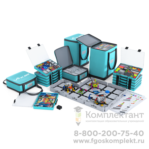 Наборы VEX GO предназначены для учащихся начальной школы. Данная платформа обладает ярким дизайном и удобным программным обеспечением на русском языке и обучающими материалами для полного погружения учащихся в процесс программирования собранных роботов. Наборы включают в себя детали для сборки моделей, инструмент для более удобной сборки/разборки роботов, приводы (моторы), позволяющие реализовывать не только подвижные платформы, но и системы захвата объектов, электрический магнит, который позволяет манипулировать металлическими объектами на поле, реализуя операции по перемещению и сортировке, датчики касания и расстояния, контроллер управления и аккумулятор.