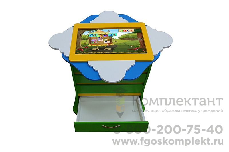 Комплекс оснащен выдвижным ящиком для хранения методических или любых других материалов. Сенсорный экран закрыт ударопрочным закаленным стеклом, что делает использование комплекса безопасным для детей.