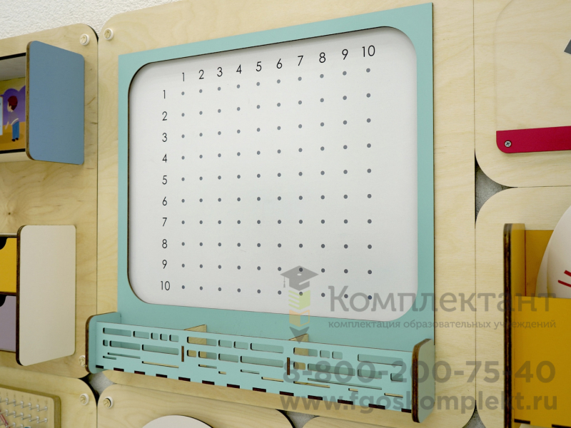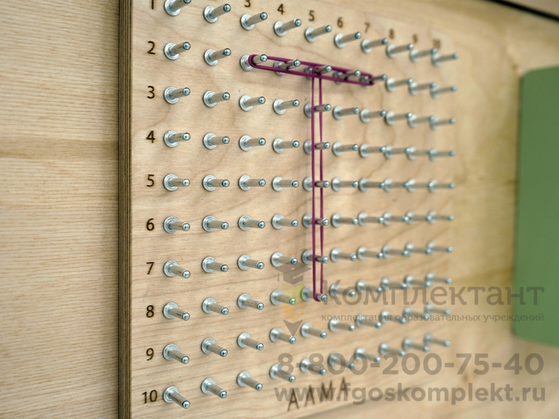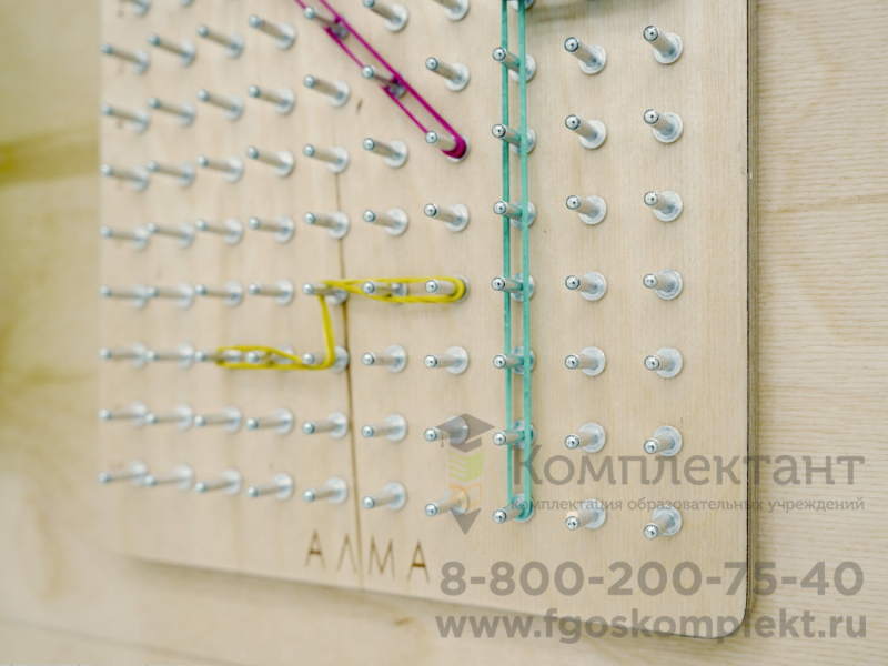 - Модуль «Геоборд». С помощью резинок малыши могут выкладывать буквы и символы, что педагог рисует на магнитно-маркерной доске, принт которой повторяет поверхность геоборда. Это развивает мелкую моторику рук, а стимуляция моторных навыков пальцев рук у детей активизирует речевой центр в головном мозге.