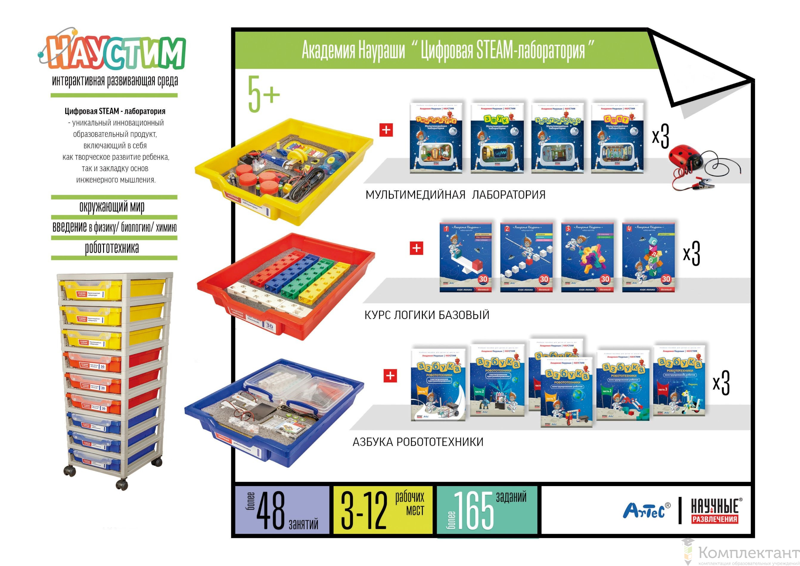Цифровая STEAM-лаборатория — базовый продукт линейки «Академия Наураши». Это уникальный инновационный образовательный комплекс, который включает в себя более 165 заданий (минимум 48 занятий), направленных как на творческое развитие ребенка, так и на закладку основ инженерного мышления.