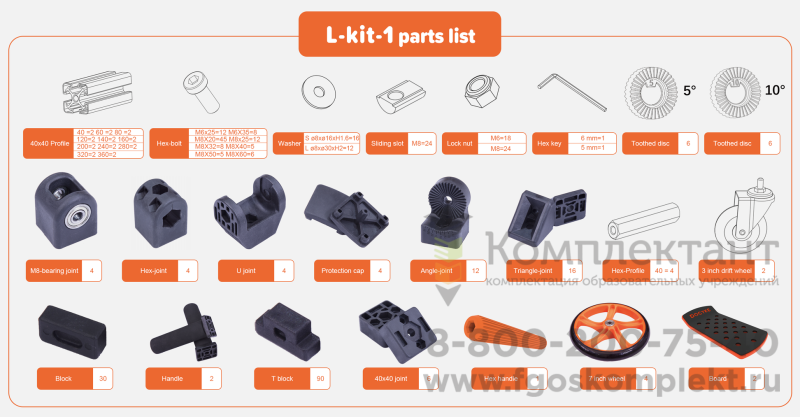 Все комплекты Docyke полностью совместимы между собой. Элементы наборов соединяются винтами М6 и М8, поэтому, если Вы хотите улучшить свой дизайн с помощью нестандартных элементов, вы можете легко сделать это с помощью универсальных элементов крепления.
