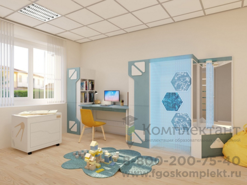 Комплекс включает встроенную световую песочницу, место под конструирование с мягким магнитным конструктором «МАККИ 37», место психологической разгрузки с фиброоптическим душем и воздушно-пузырьковой колонной, встроенную музыкальную систему и многое другое.