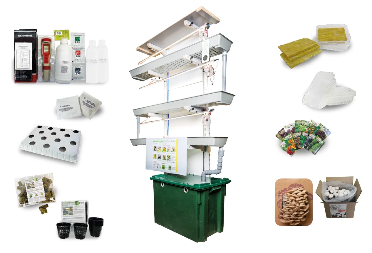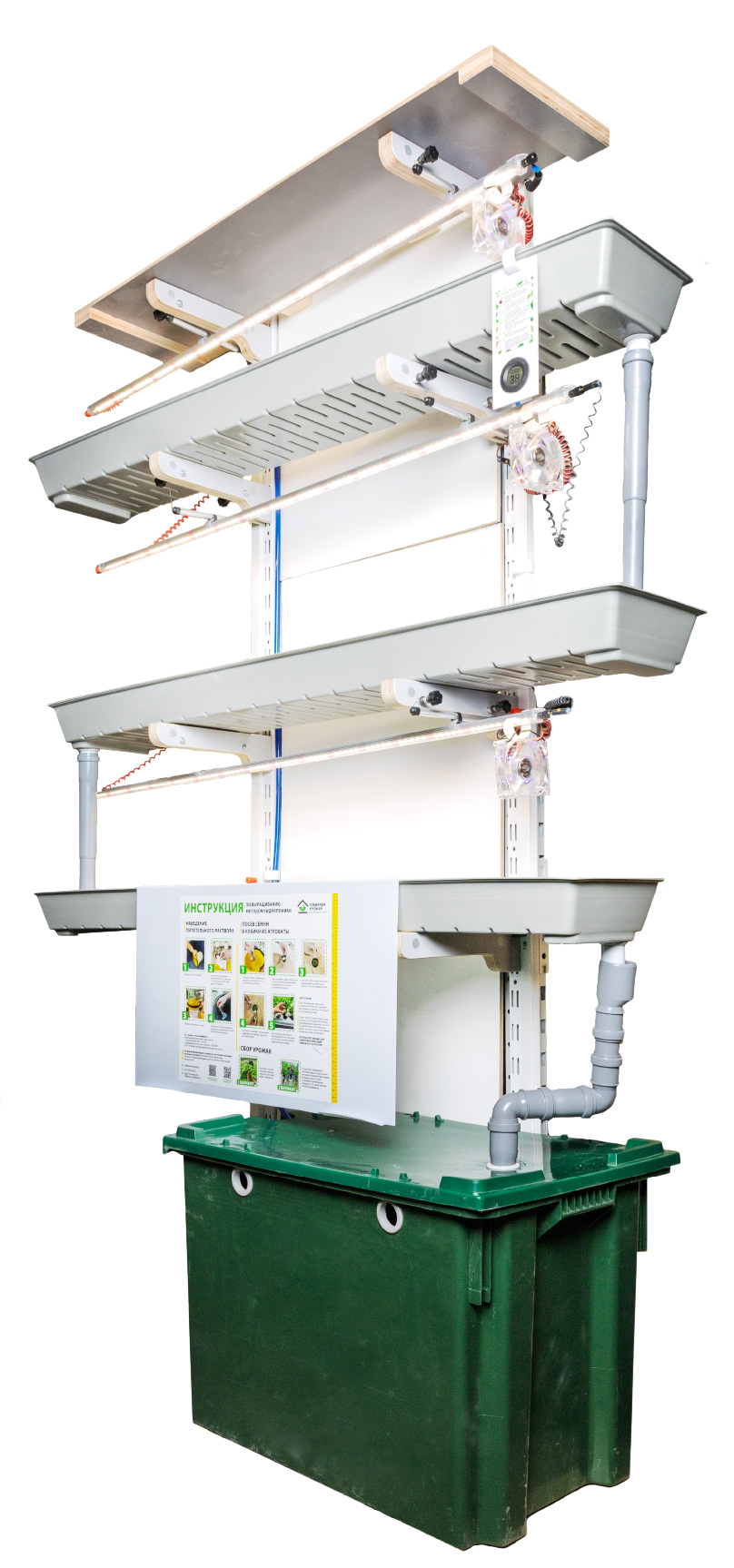 (0.28 м2 посевной площади) с ребристым дном, универсальной системой контроля уровня подтопления и слива. С возможностью выращивания 3 способами: Периодическое подтопление; Тонкий слой; DWC - система глубоководных культур с компрессором и аэрационным камнем.
