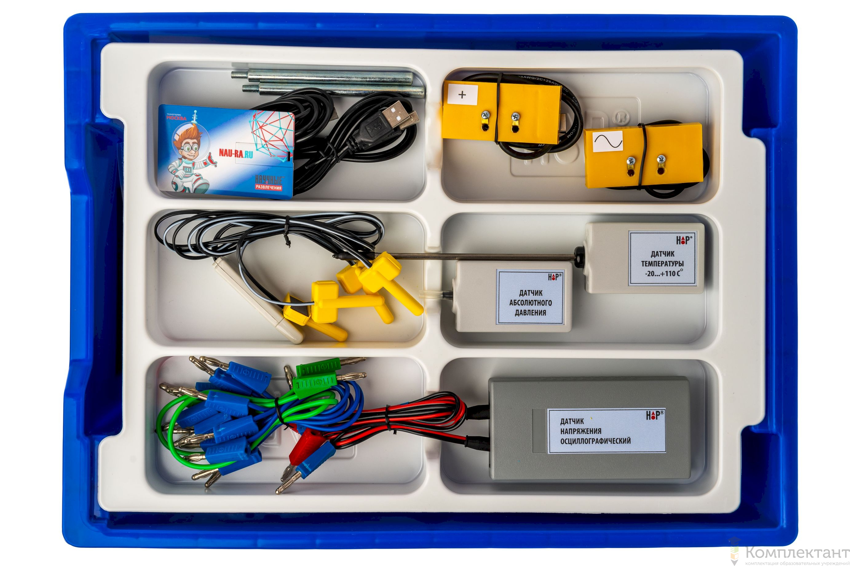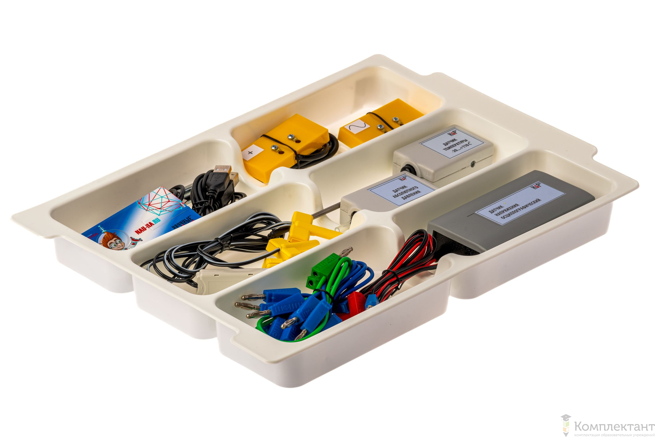 Все оборудование цифровой лаборатории (кроме скамьи лабораторной) укомплектовано в пластиковые системы хранения, которые закрываются прозрачной пластиковой крышкой на защелках для обеспечения наблюдения за содержимым. Комплект оборудования и датчики в системах хранения располагаются на ложементах в индивидуальных ячейках.