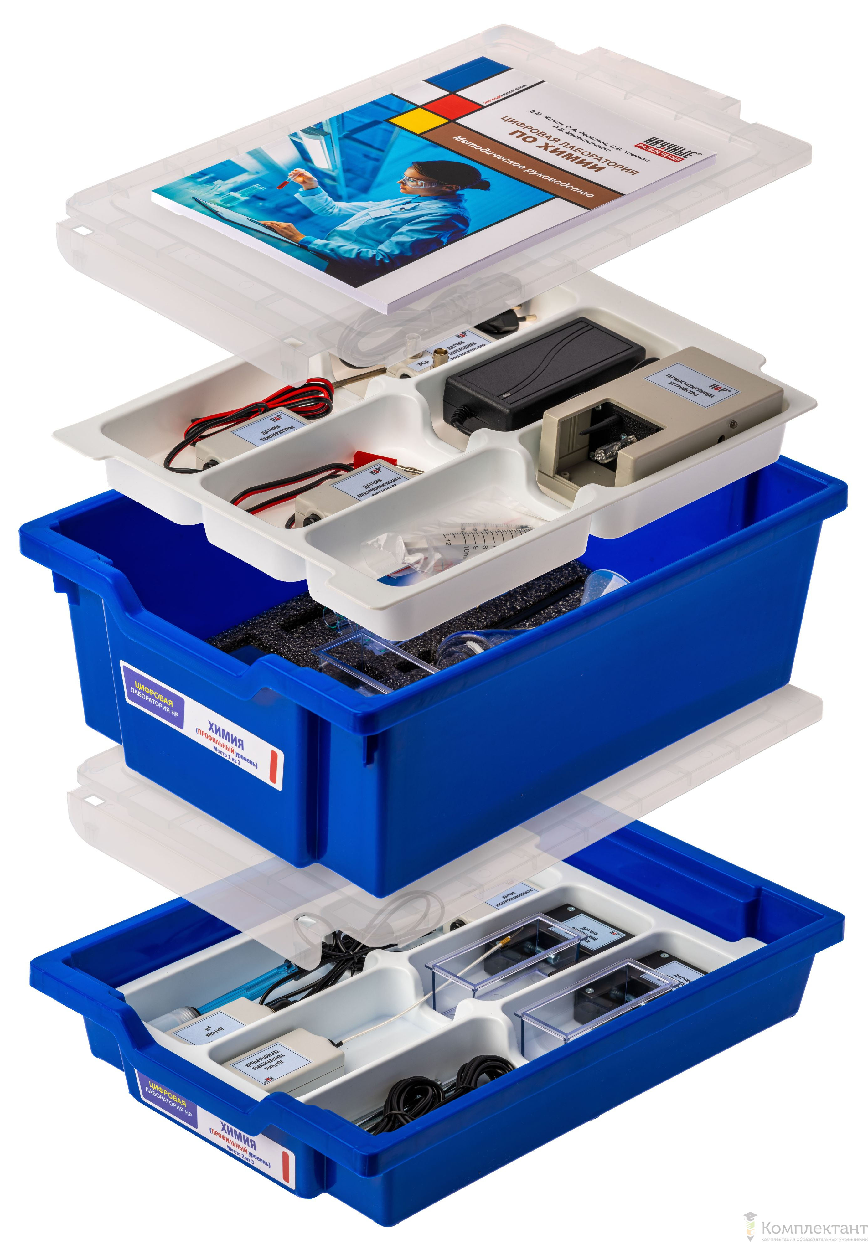 Цифровая лаборатория укомплектована в пластиковую систему хранения, которая закрывается прозрачной пластиковой крышкой на защелках для обеспечения наблюдения за содержимым. Комплект оборудования и датчики в системе хранения располагаются на ложементах.